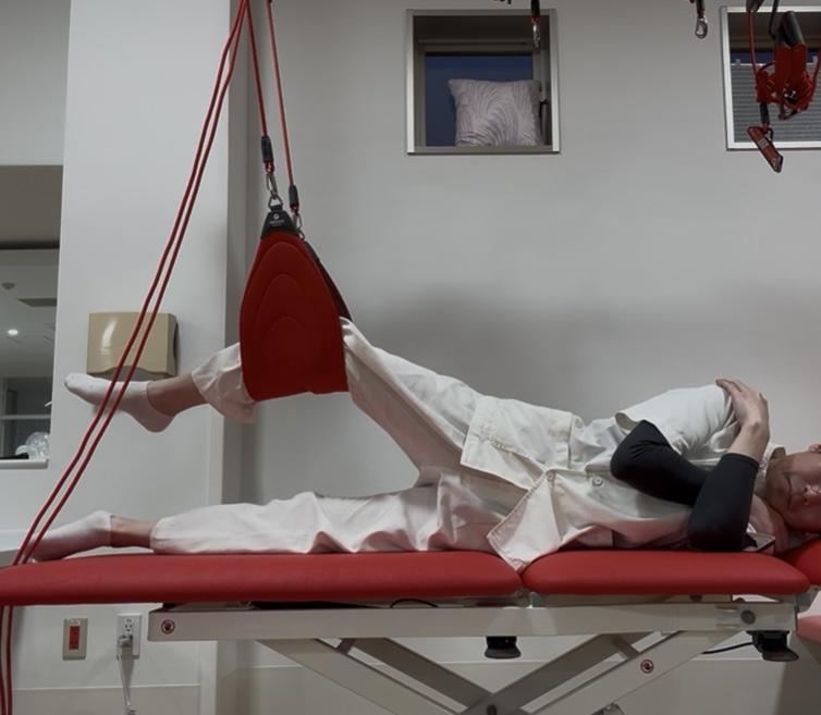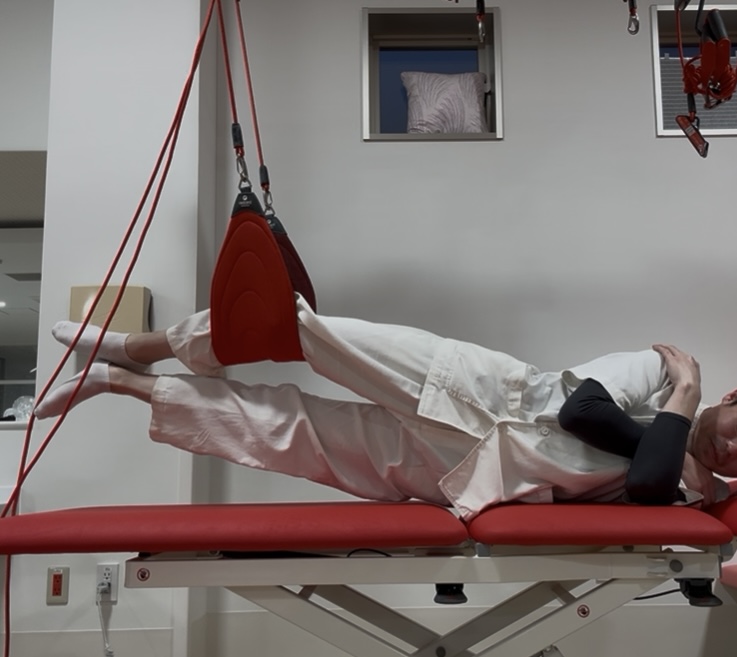レッドコードでは、その他に使用するスリングの数や下肢位置を変化させることによって、運動負荷や強化範囲の調整が可能です。